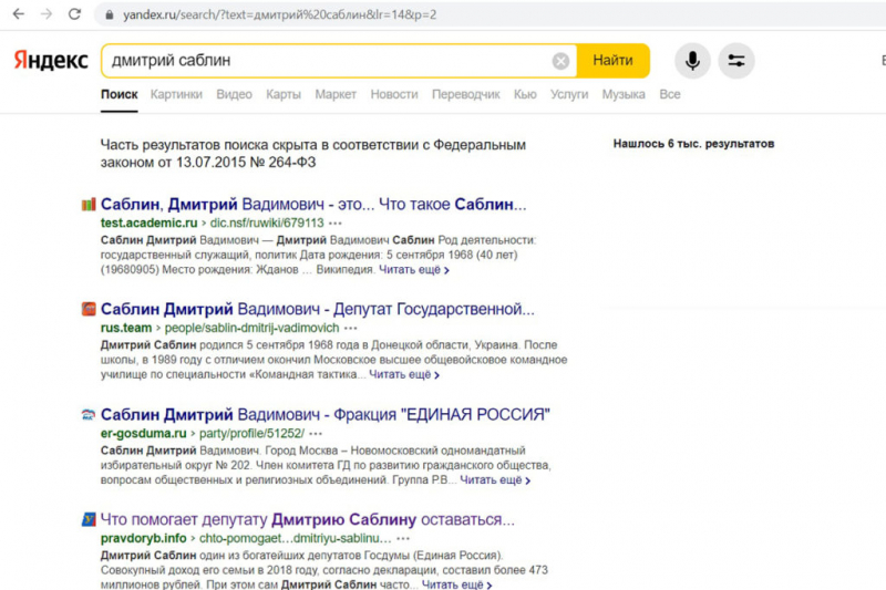 Если ввести в поисковик «Яндекса» запрос «Дмитрий Саблин», то на некоторых страницах выдачи появится сообщение, что «часть результатов поиска скрыта в соответствии с Федеральным законом от 13.07.2015 № 264-ФЗ». Какие именно материалы были удалены из поиска, а также их количество, неизвестно.