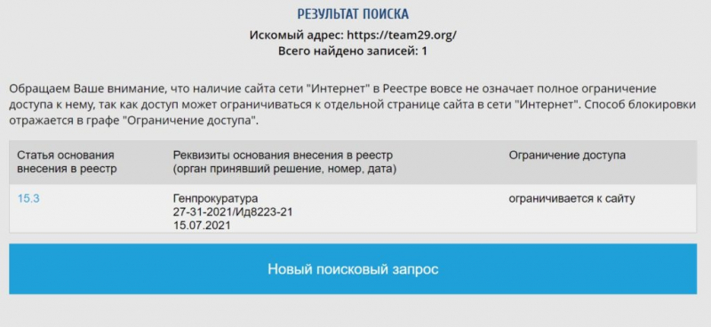 Как обнаружило «МБХ медиа» в реестре заблокированных ресурсов, сайт «Команды 29» был заблокирован 15 июля по решению Генпрокуратуры. Ведомство сослалось на статью 15.3 Федерального закона «Об информации, информационных технологиях и о защите информации».
