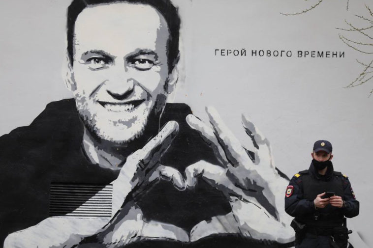 Полицейский на фоне граффити с Навальным. Фото: @ZolotorevskiyB / Twitter