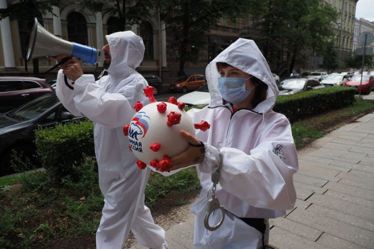 Накануне активисты надели медицинские защитные костюмы, зачитали свой манифест, затем разбили макет коронавируса с символикой «Единой России». Затем нацболы приковали себя к зданию Минюста.